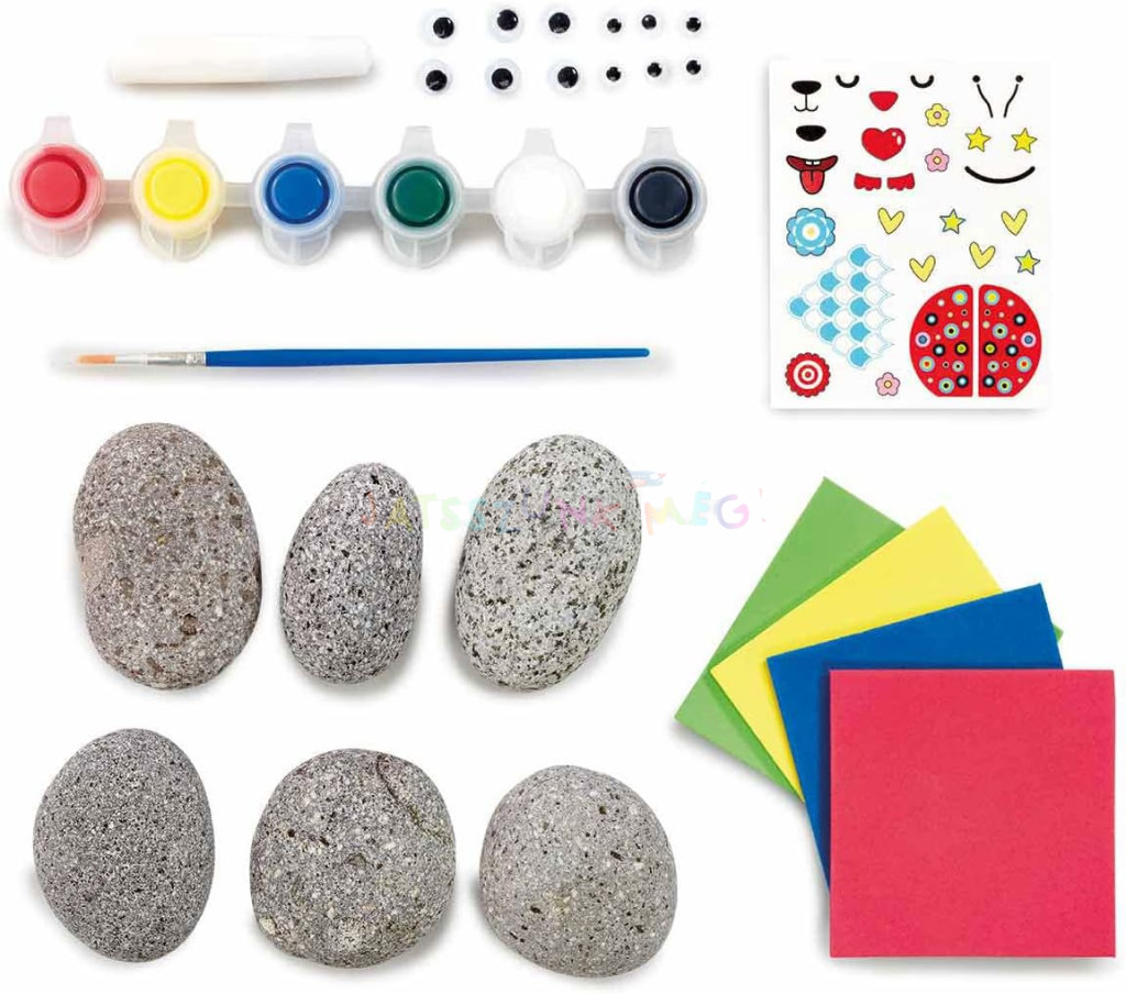 A készlet tartalma: 6 db kavics, 6 db akrilfesték, 1 db ecset, 6 db mozgatható szemkészlet,