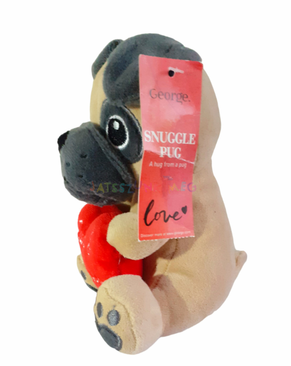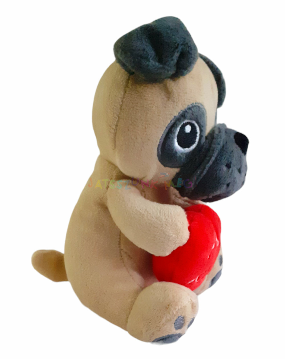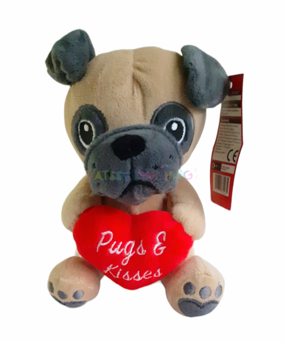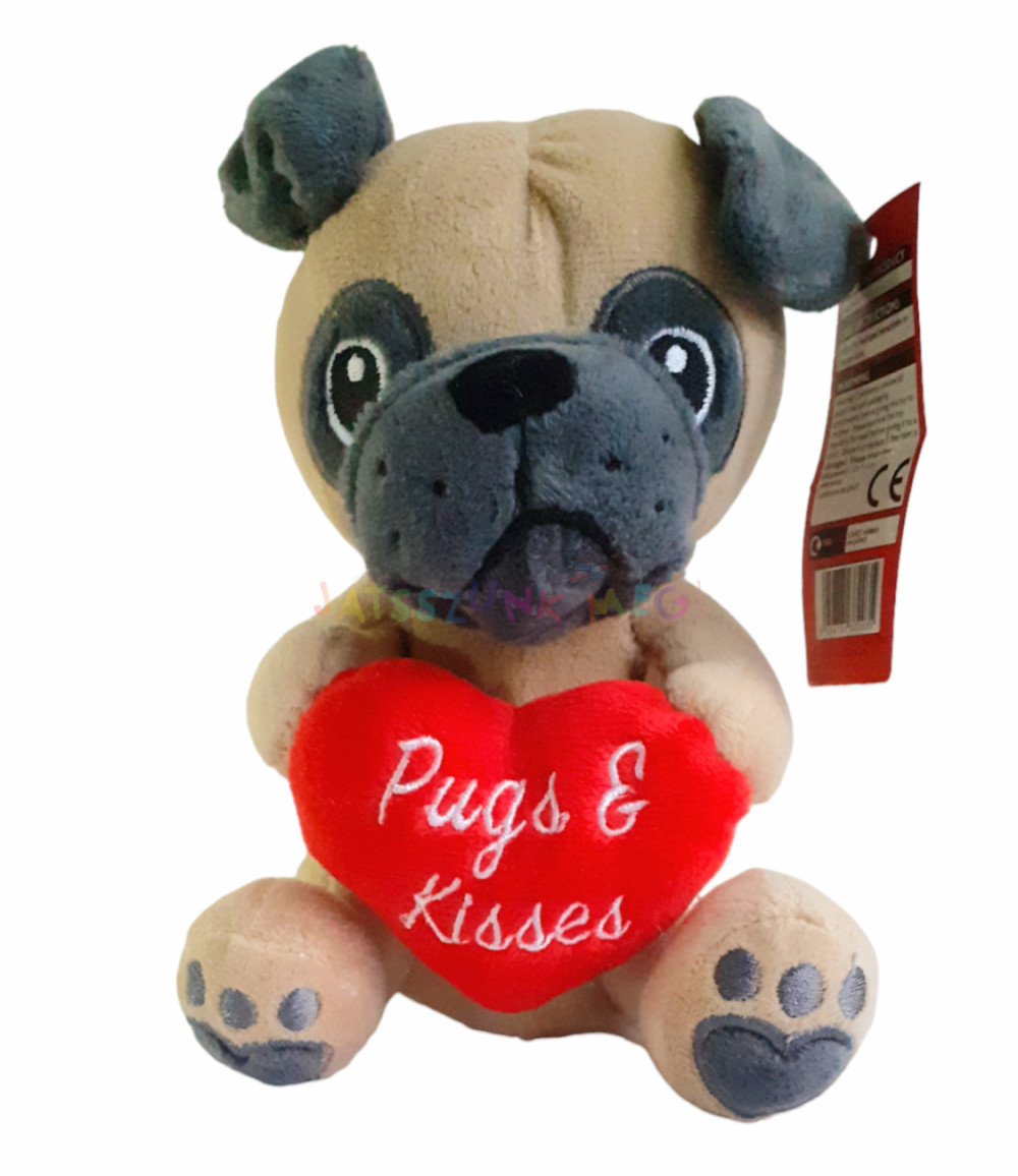 piros plüss szívet tart a mancsaiban amire "Pugs & Kisses" felirat van hímezve.