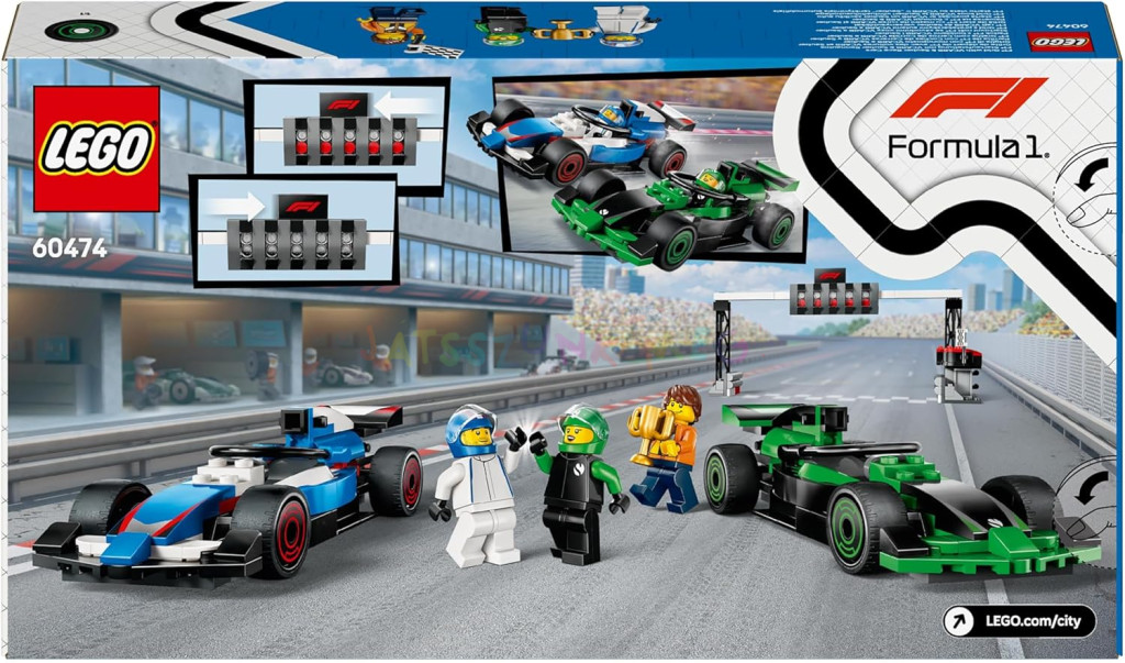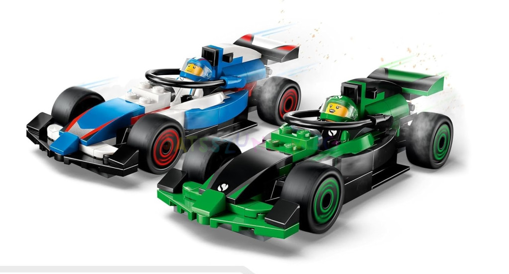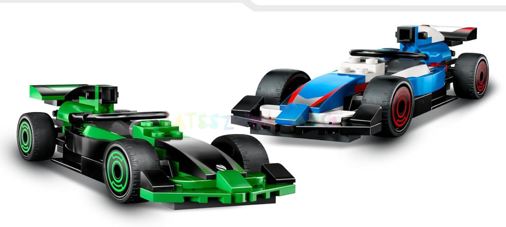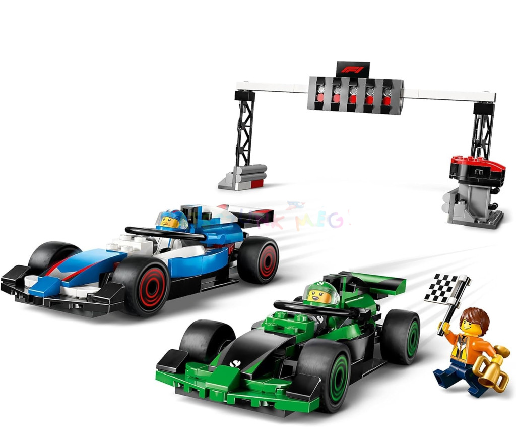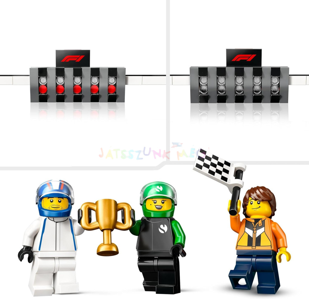továbbá Sauber és VCARB pilóták minifiguráit, egy pályabíró minifiguráját és egy győzelmi trófeát