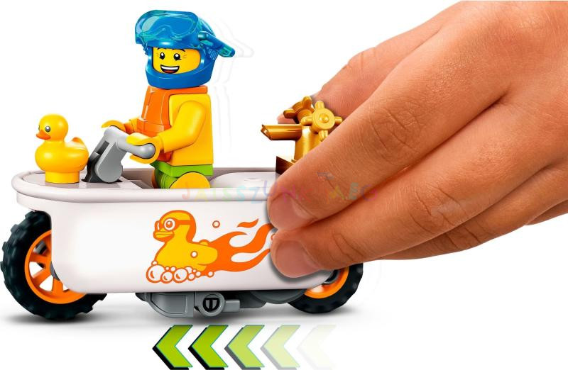 emellett egy LEGO® City Stuntz Sudsy Simon kádversenyző minifigura, gumikacsa, búvárpipa, maszk és mentőmellény is vár rájuk