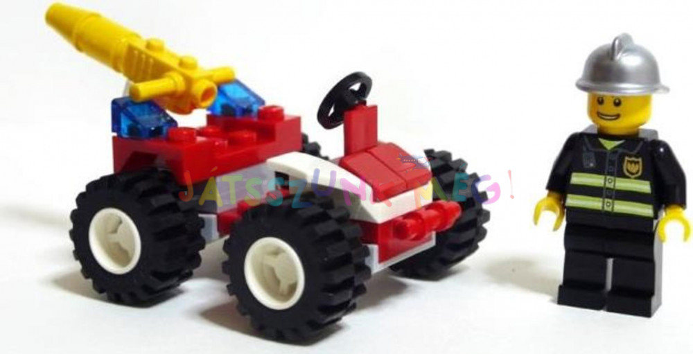 A készlet egy kis piros-fehér tűzoltójárműből áll, négy fehér kerékkel és fekete gumikkal.