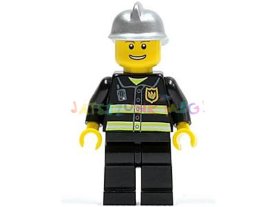A Tűzoltónak ezüst sisakja, mosolygós arca, fekete tűzoltóruhája van, aminek bal oldalán walkie-talkie, jobbján tűzoltói jelvény