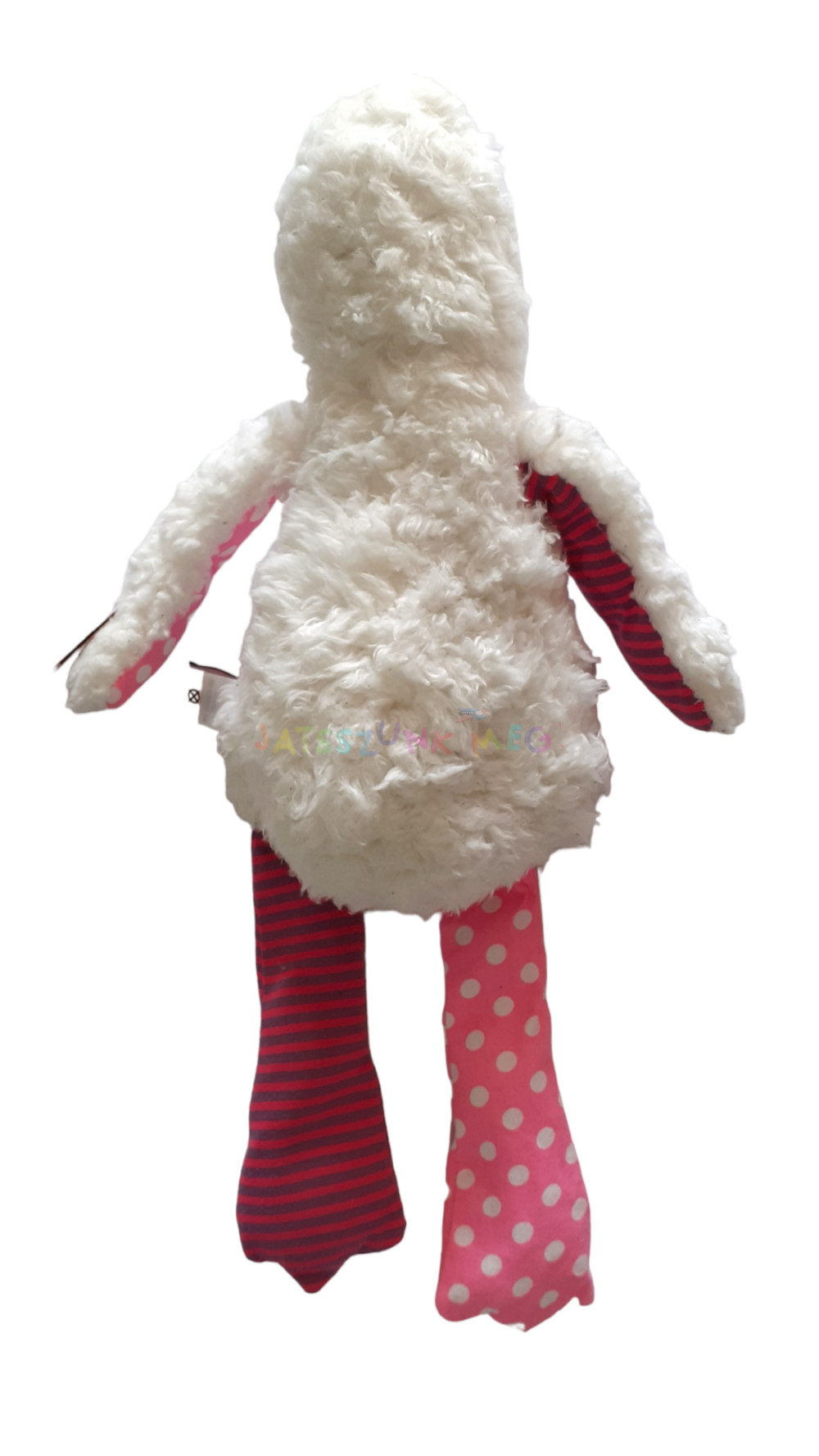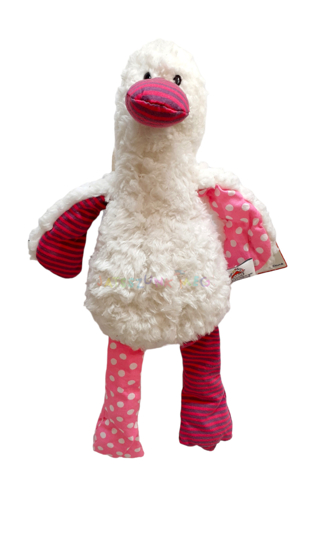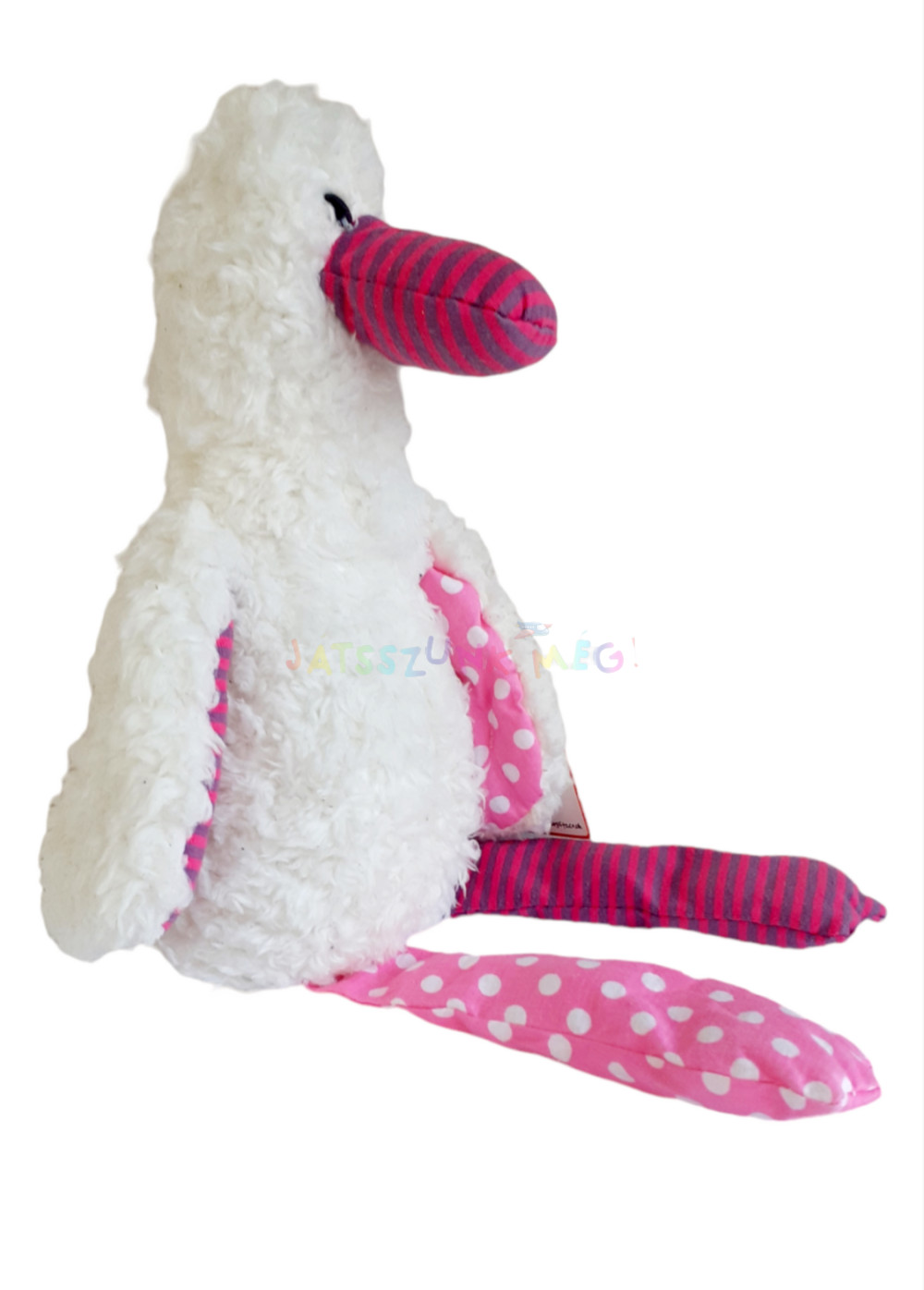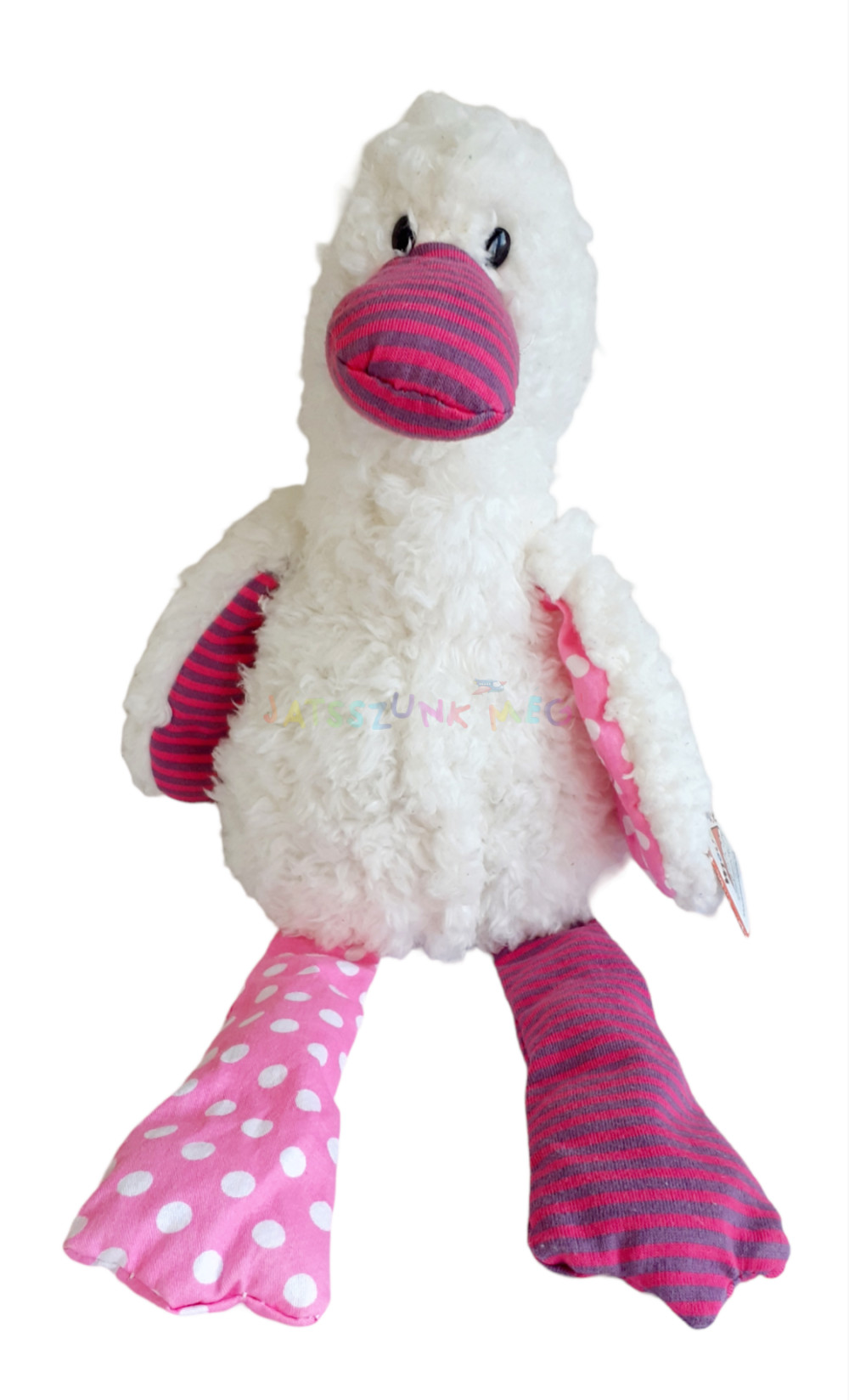 Szuper puha plüss kacsa figura, lábai és szárnya belseje játékos csíkos és pöttyös mintázatú.