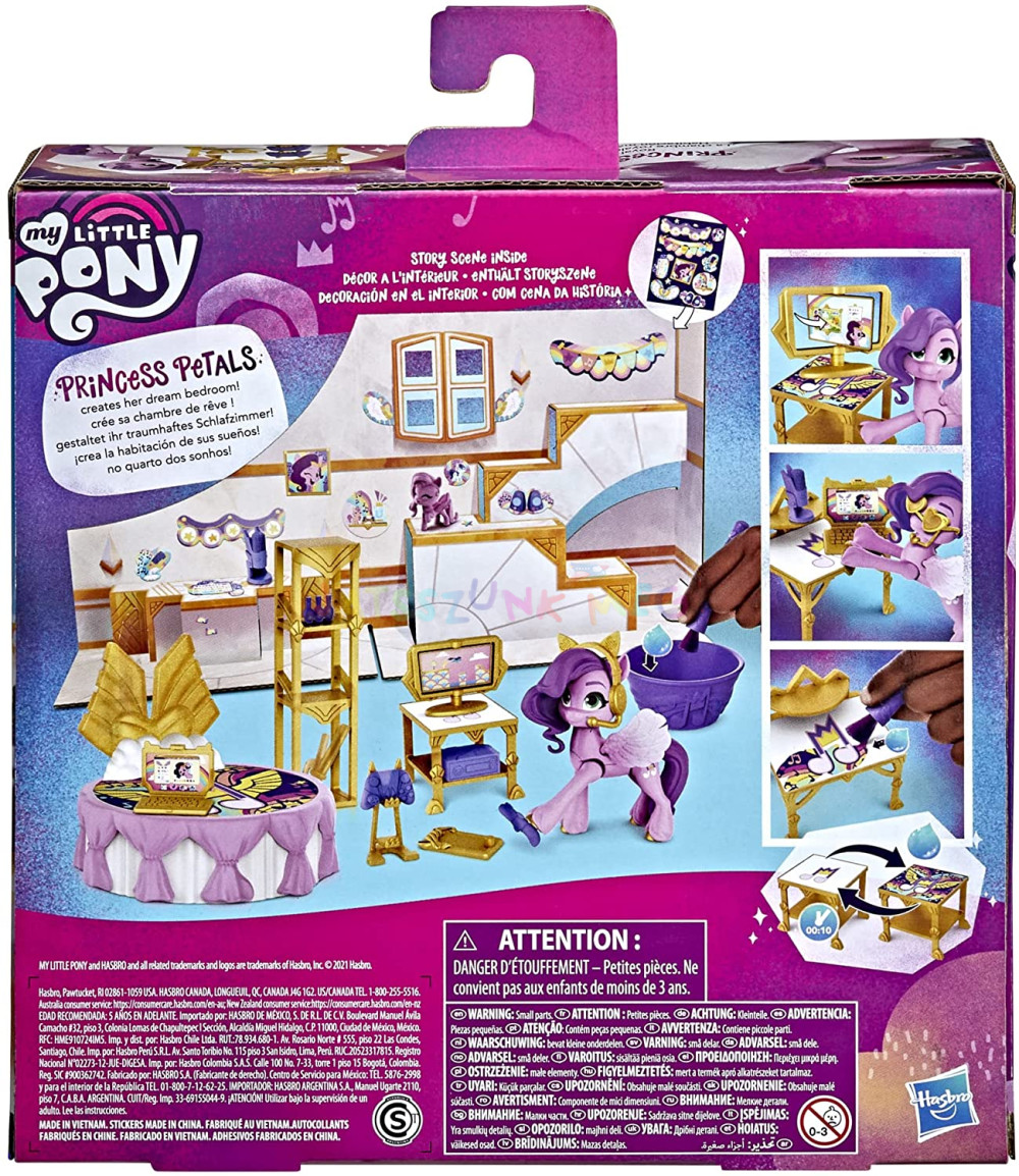Tartalmaz egy 3 hüvelykes Princess Petals rózsaszín póni figurát, karakterek által ihletett hangjegyekkel.