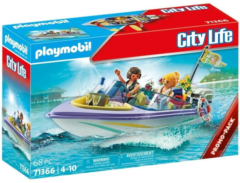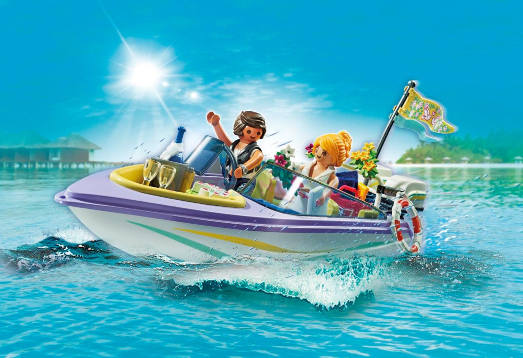 A készlet tartalmaz egy motorcsónakot, két figurát, egy úszógumit, egy zászlót, élelmet és egyéb kiegészítőket.