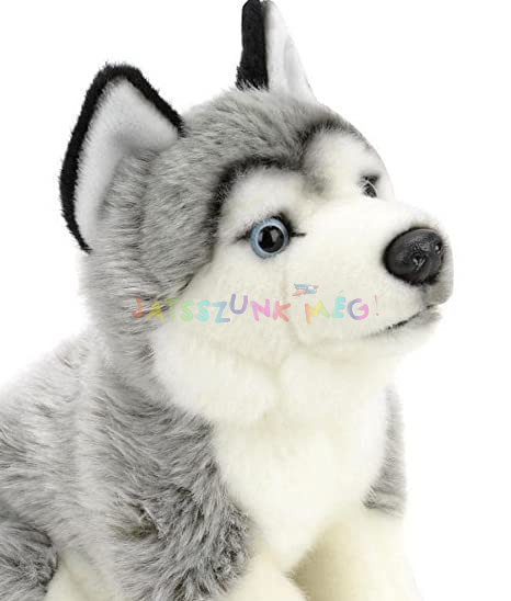A husky kutyának szuper puha bundája, műanyag orra, gyönyörű kék szemei és hosszú farka vannak